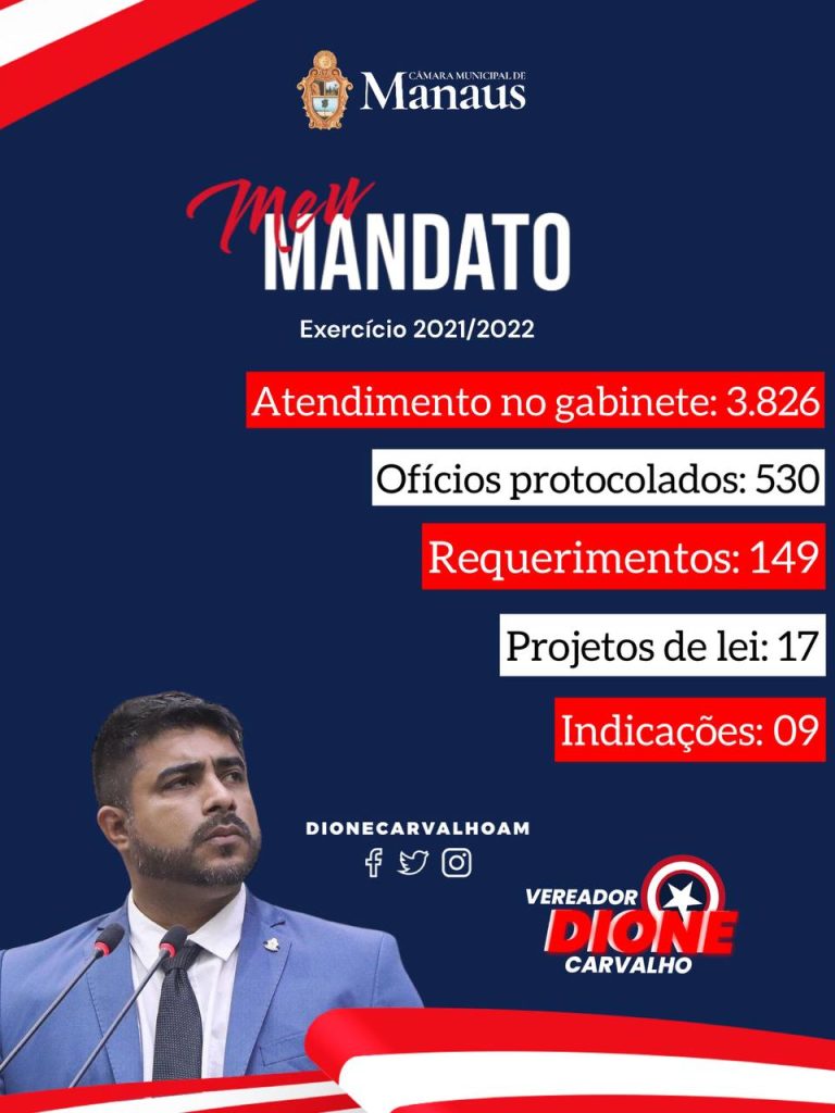 O Vereador Dione Carvalho avaliou positivamente seu mandato na Câmara Municipal de Manaus (CMM) em 2022. Entre os principais trabalhos estão mais de 530 ofícios solicitando melhorias para diversos bairros da cidade.